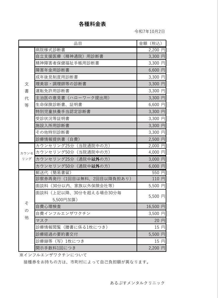 当院では、別紙の項目について、その利用回数に応じた実費の負担をお願いしております。