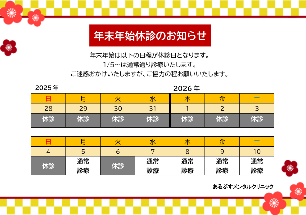 2025年12月28日~2026年1月4日まで休診とさせていただきます。